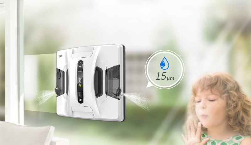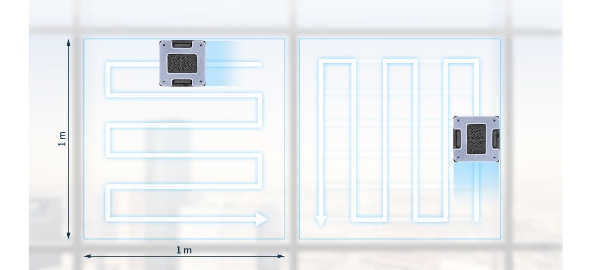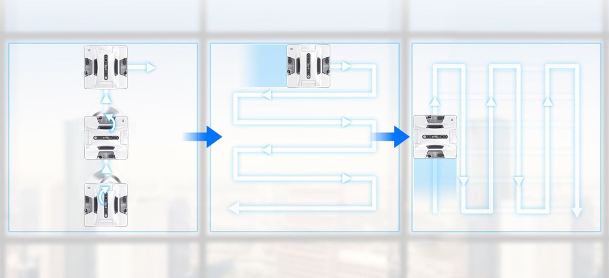 HOBOT автоматично визначає межі вікна. Він запрограмований на рух по зигзагоподібній траєкторії, спочатку по горизонталі, потім по вертикалі, ретельно очищуючи всю поверхню і не пропускаючи жодної плями.