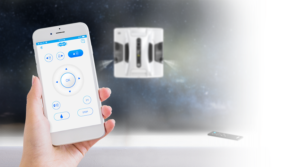 HOBOT можна керувати з пристроїв iOS/Android через з'єднання Bluetooth та за допомогою пульта дистанційного керування, що входить до комплекту постачання
